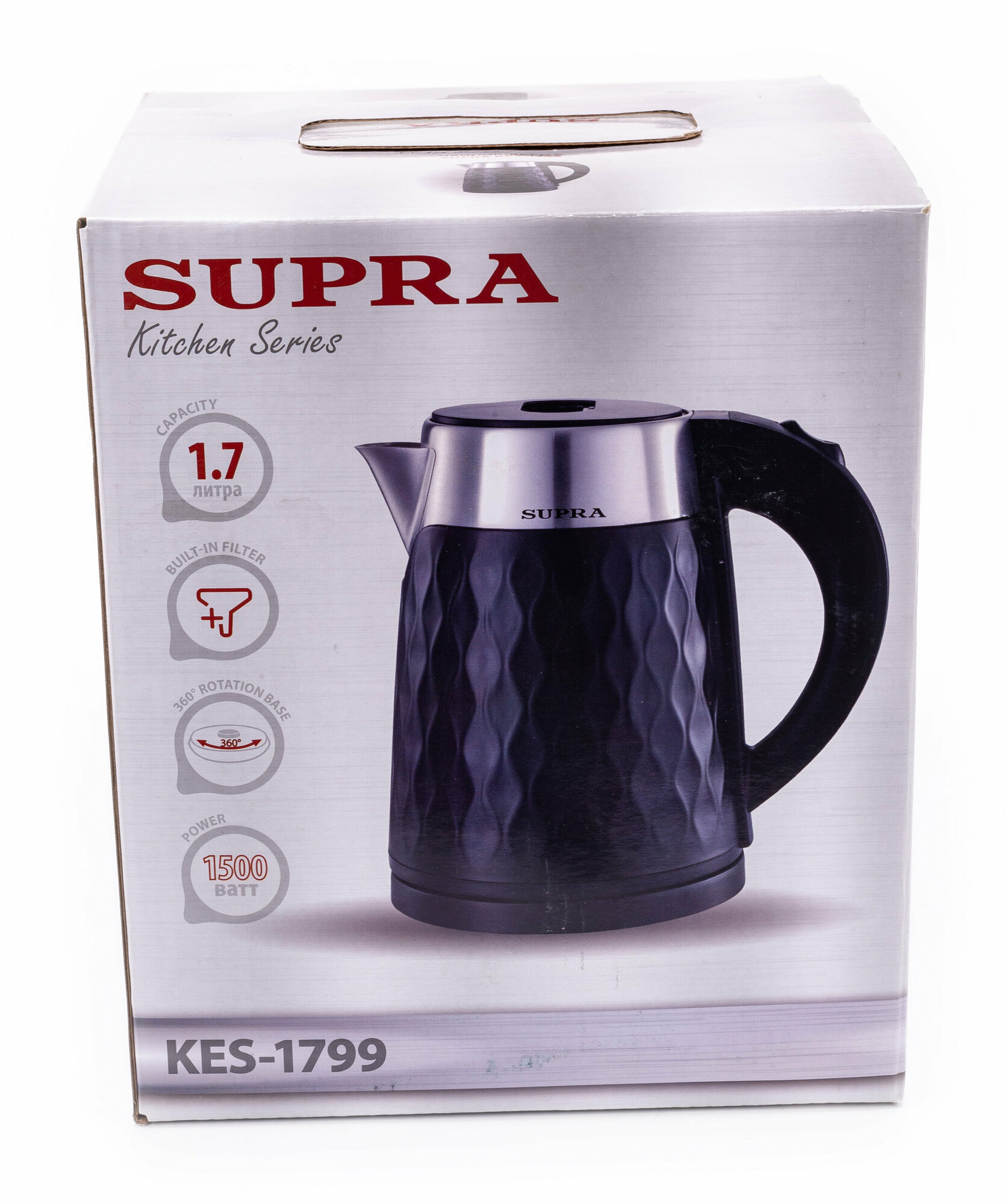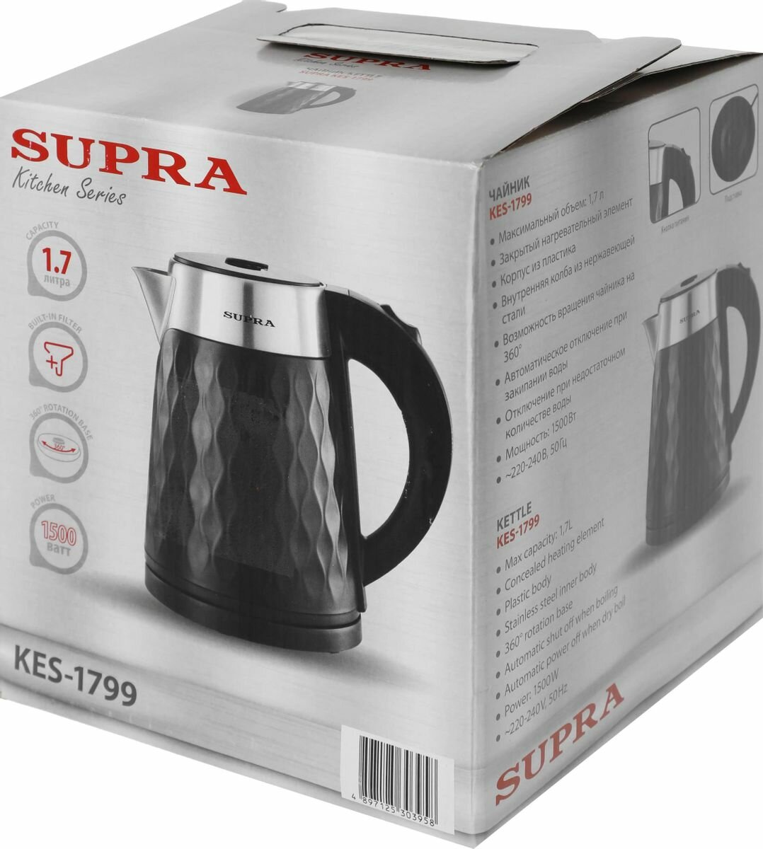 Чайник электрический Supra, KES-1799, черный, 1.7 л, 1500 Вт, скрытый нагревательный элемент, металл