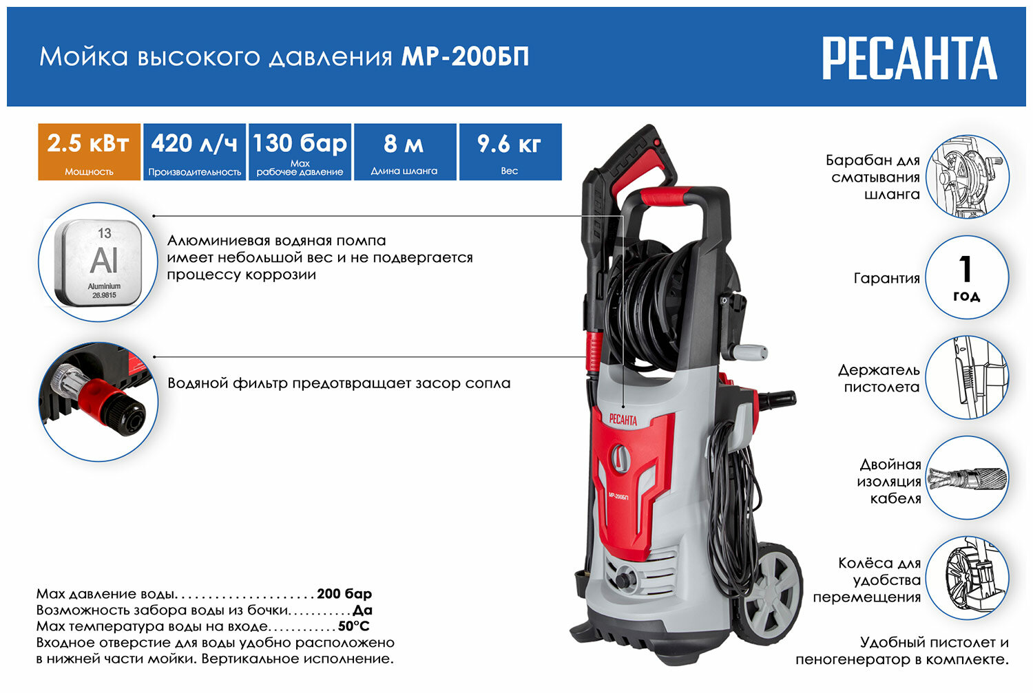 Мойка высокого давления РЕСАНТА МР-200БП, рабочее давление 130 бар, максимальное давление 200 бар