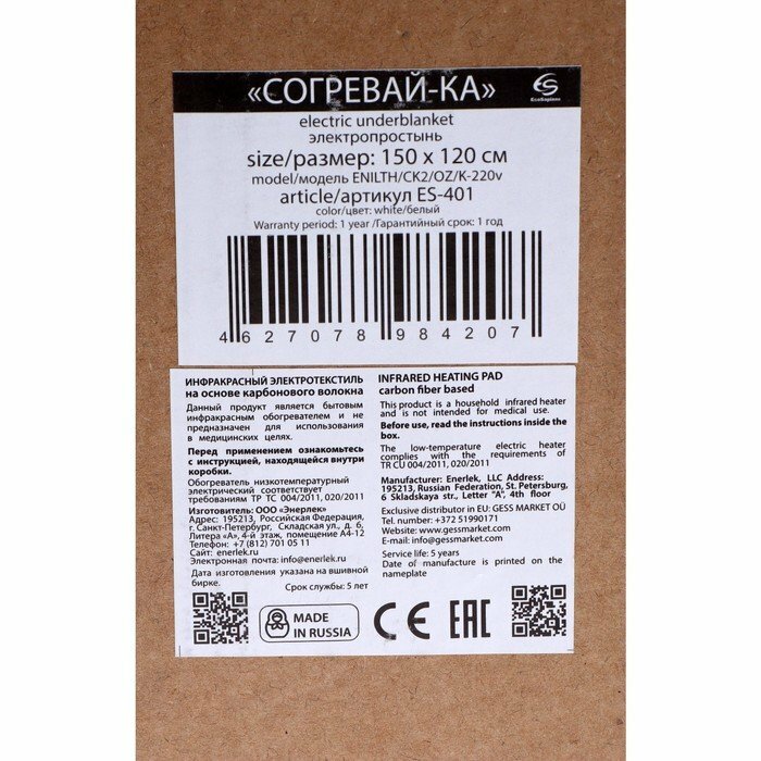 EcoSapiens ES-401 Согревай-ка 150х120 см электрическая простыня