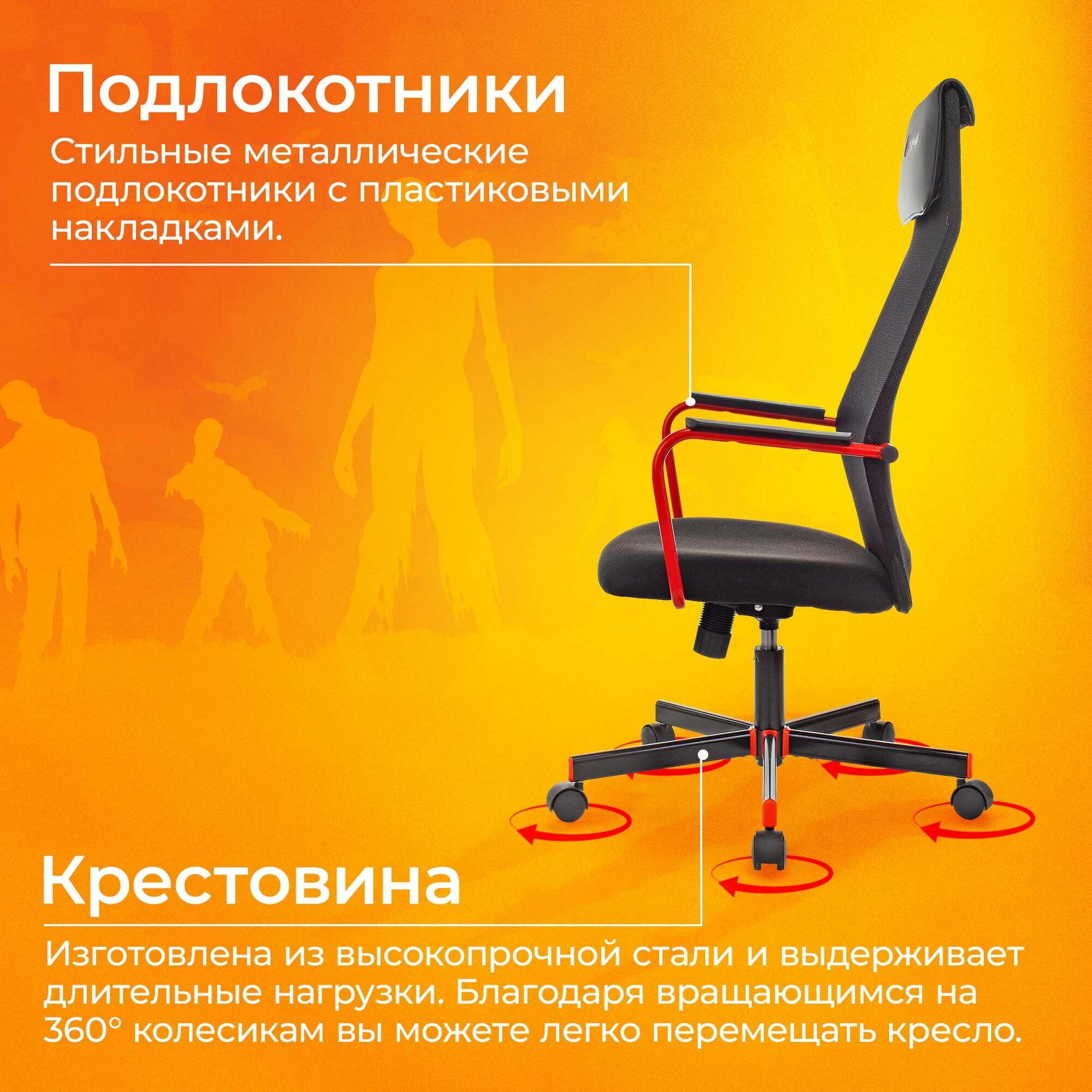Кресло игровое ZOMBIE ONE, на колесиках, сетка/ткань, черный/красный [zombie one black]