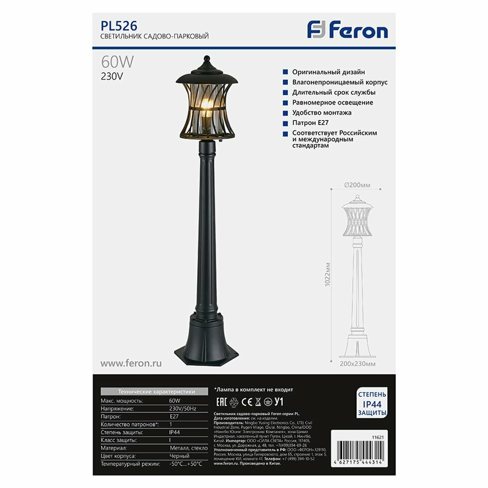 Светильник садово-парковый Feron PL526 столб 60W E27 230V, черный fr_11621