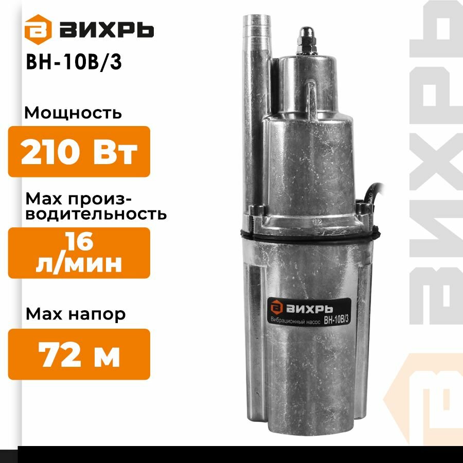 Вибрационный насос вихрь ВН-10В/3 // верхний забор, 210Вт, 16л/мин, кабель 10м, погружной для откачки воды из колодца, водоема, бассейна, малыш ручеек