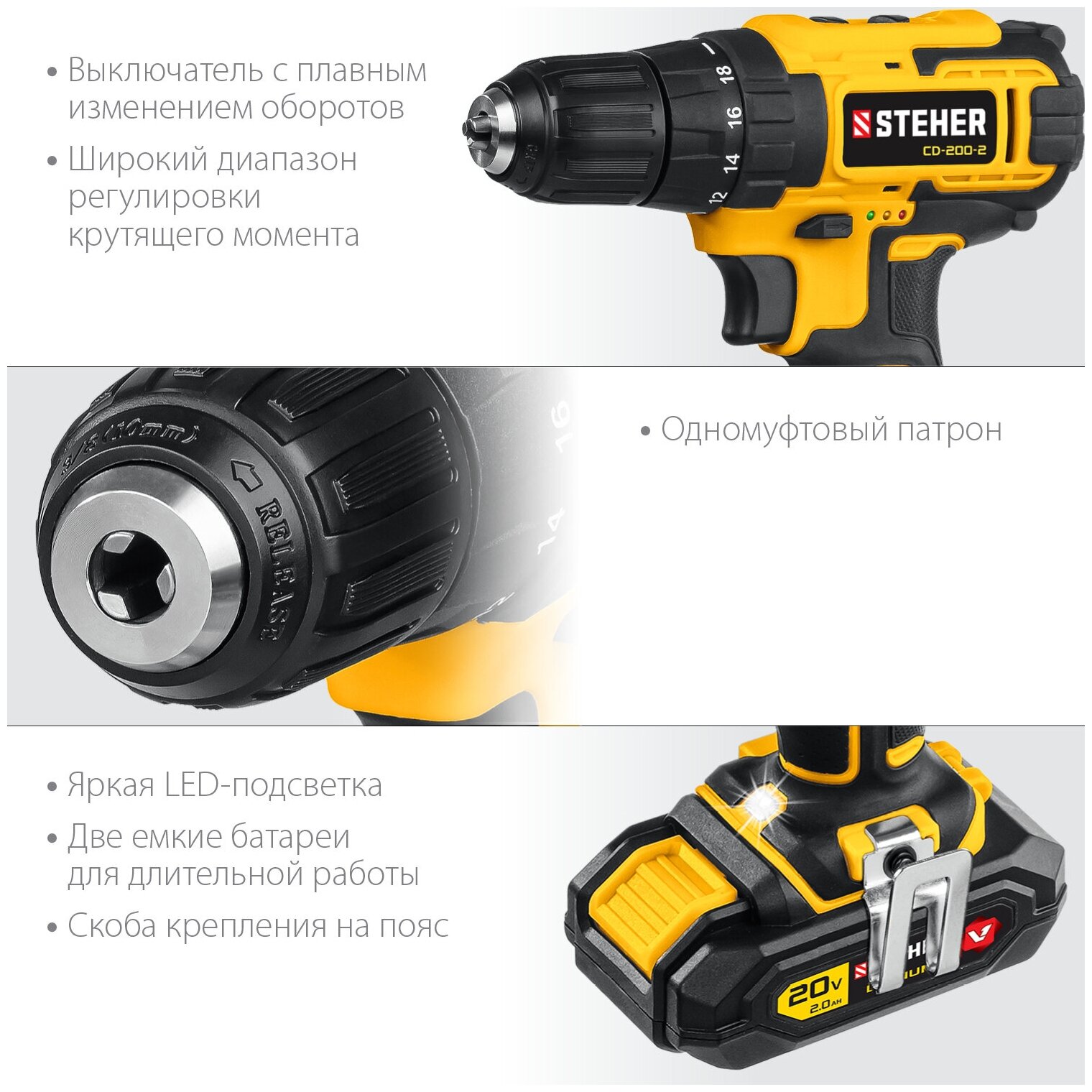 Дрель-шуруповерт STEHER 20В, 2 АКБ (2Ач) CD-200-2