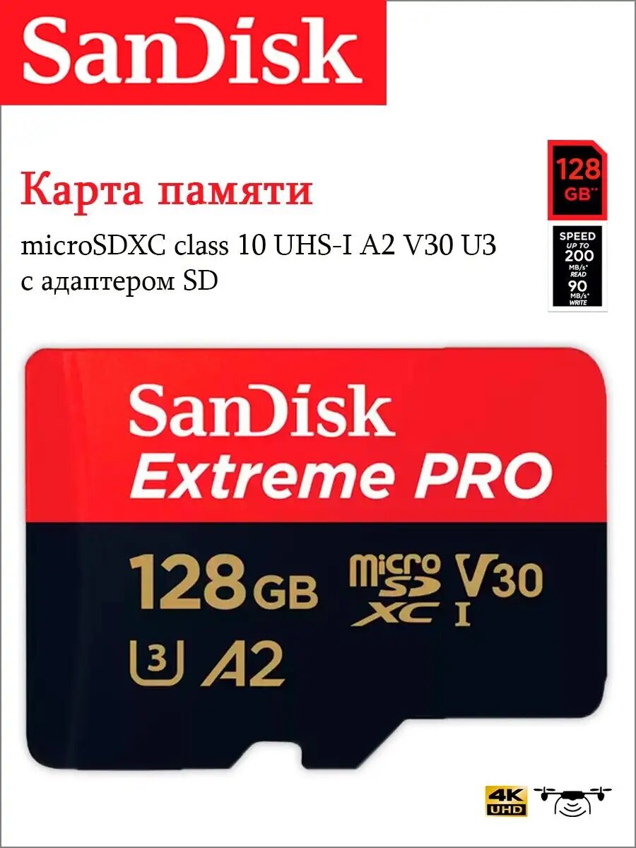 Купить Карта памяти SanDisk Extreme PRO microSDXC 128 ГБ Class 10, V30, A2, UHS Class 3, R/W 200/90 МБ/с, адаптер на SD