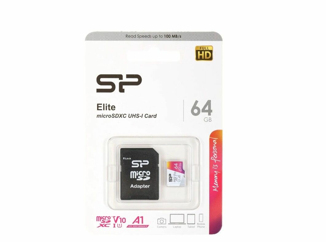 Карта памяти 64Gb - Silicon Power Elite A1 MicroSDXC Class 10 UHS-I U1 SP064GBSTXBV1V20SP с адаптером SD