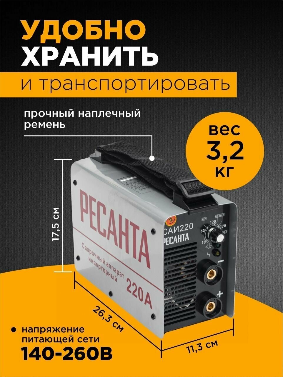 Сварочный аппарат инверторный САИ 220 РЕСАНТА, сварочный ток до 220 А, диаметр электрода до 5 мм, 65/3