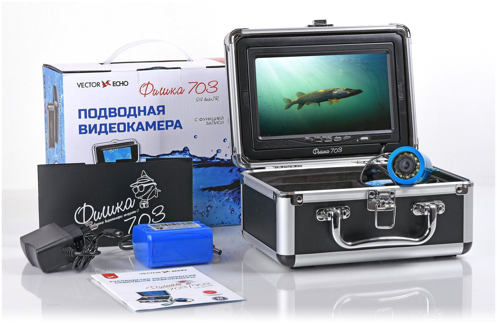 | Комплектация | Монитор с экраном 7 дюймов Подводная камера Аккумулятор Зарядное устройство 220В Карта памяти (в комплект не входит) Солнцезащитный козырёк Крепления Кейс |