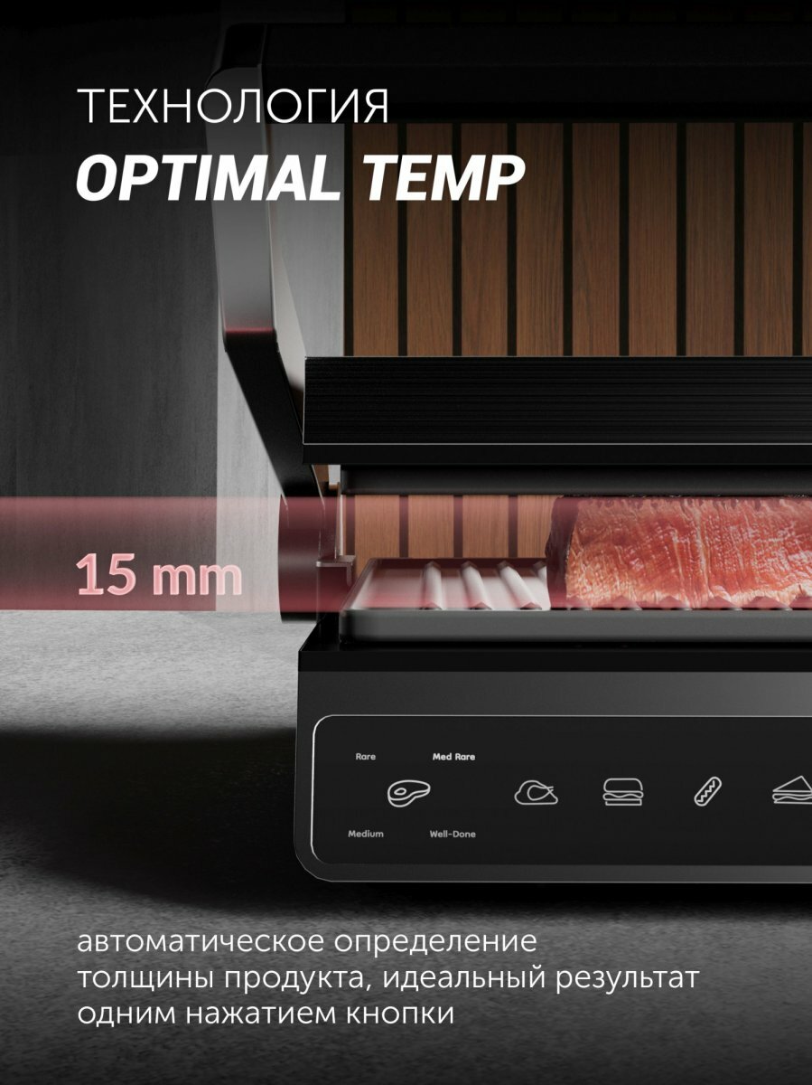 | Дополнительная информация | автоматическое определение толщины продукта; 6 автоматических программ; 4 степени прожарки: rare, med rare, medium, well done |