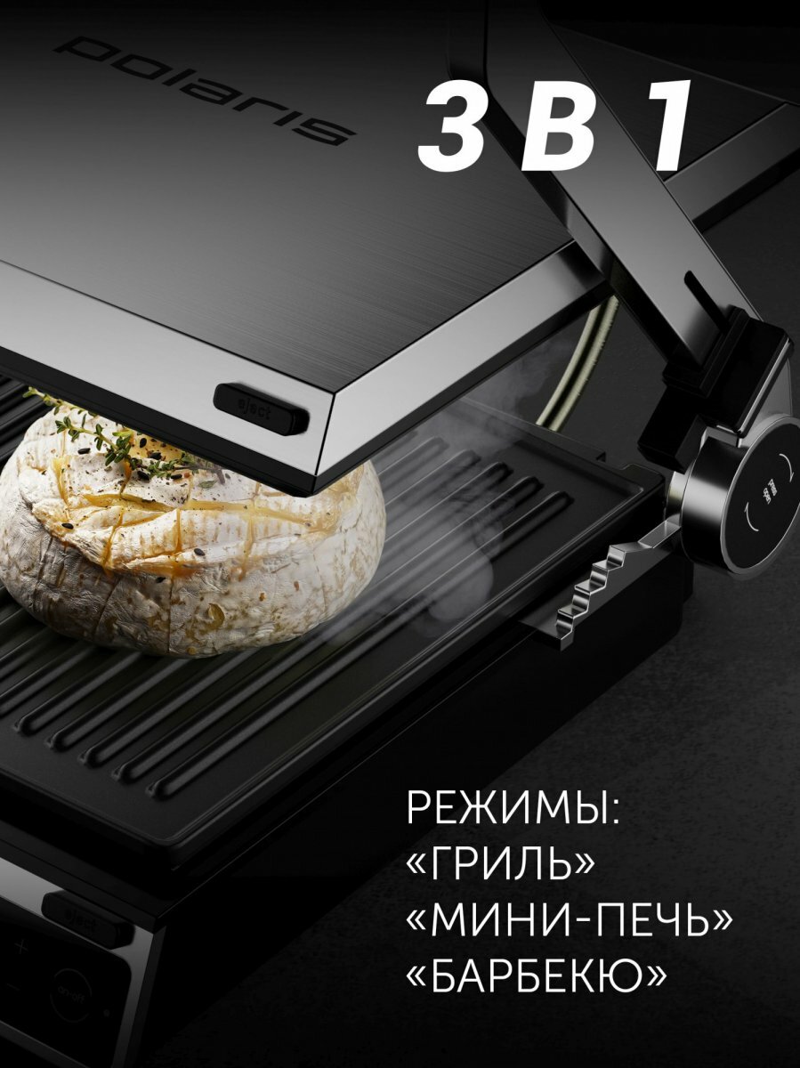 Гриль-пресс электрический Polaris PGP 2803 со съемными панелями, 4в1: гриль, барбекю, духовка, мини-печь.