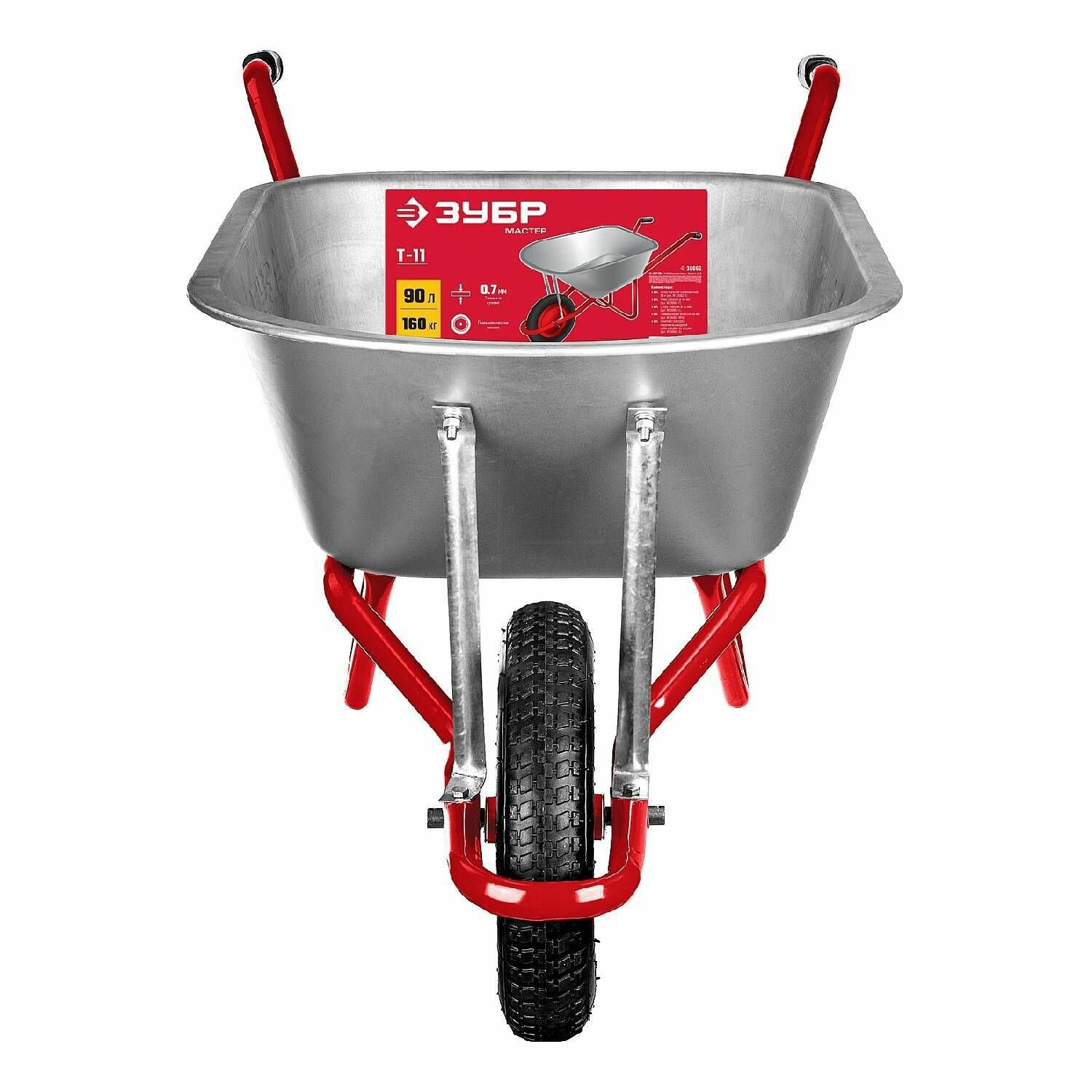 ЗУБР Т-11, 90 л, 160 кг, одноколесная, оцинкованная сталь, стальные опоры Ø25мм, садово-строительная тачка (39962)