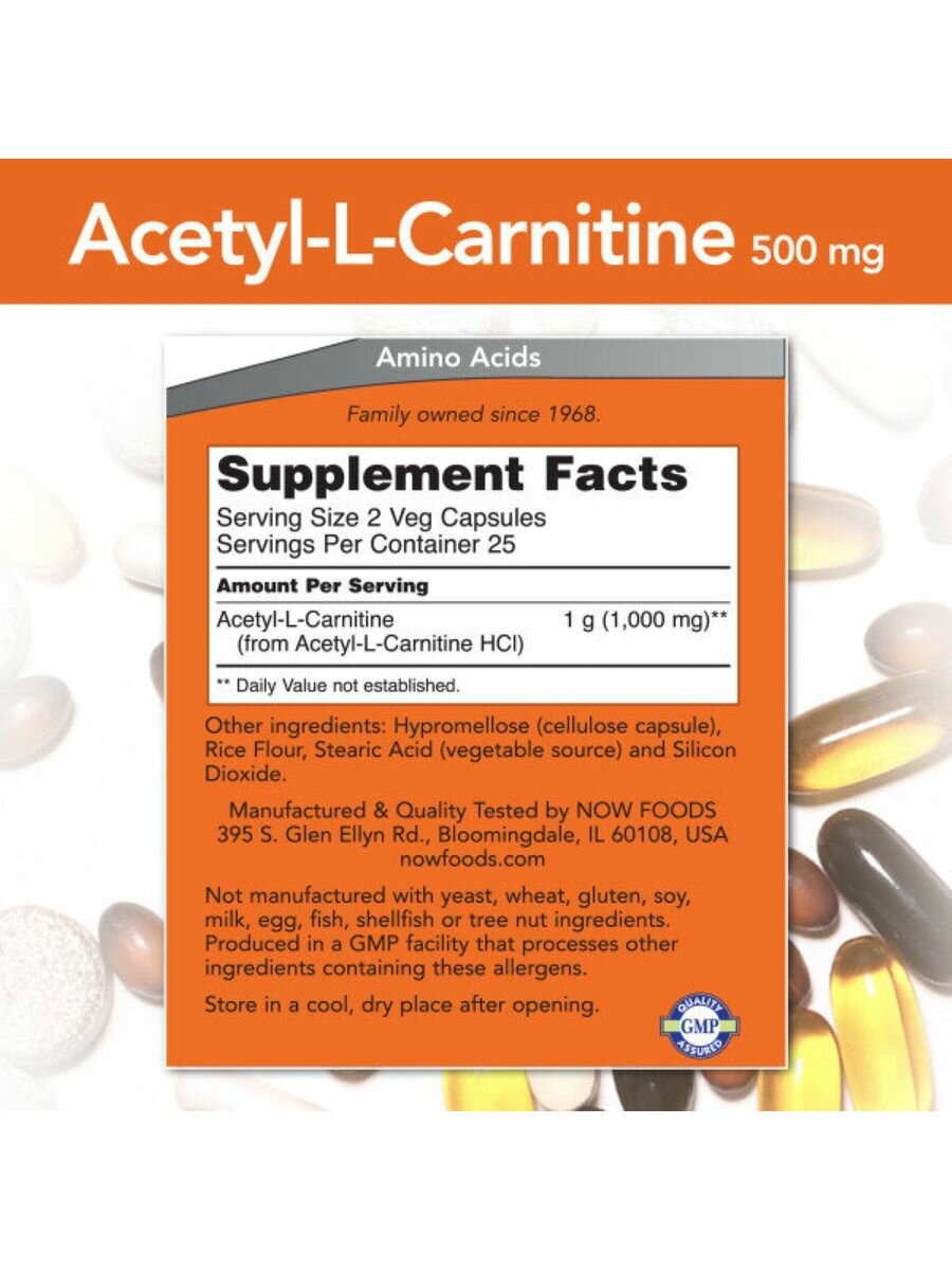 NOW Acetyl L-Carnitine 500 mg, 50 veg caps (50 таблеток)