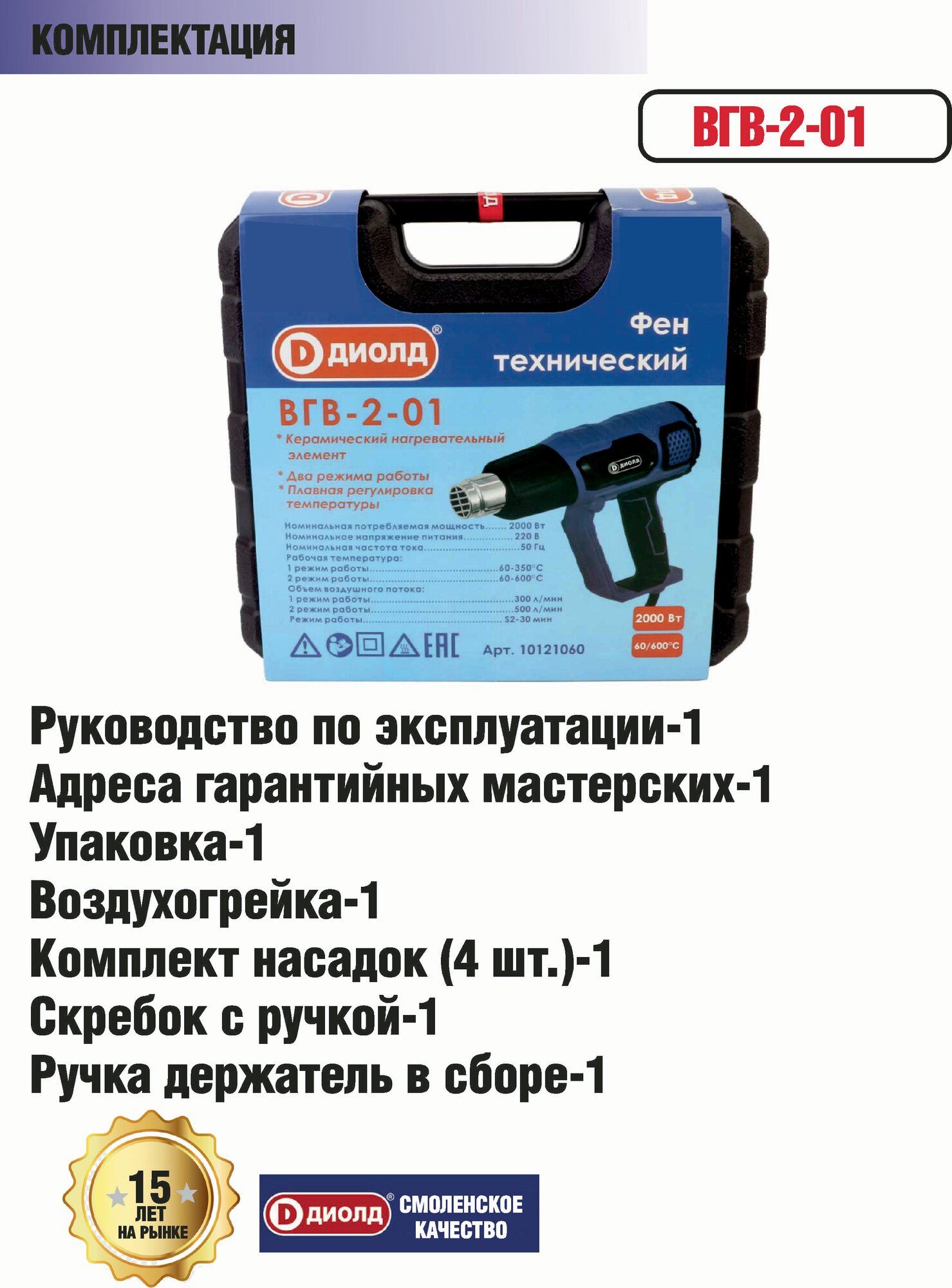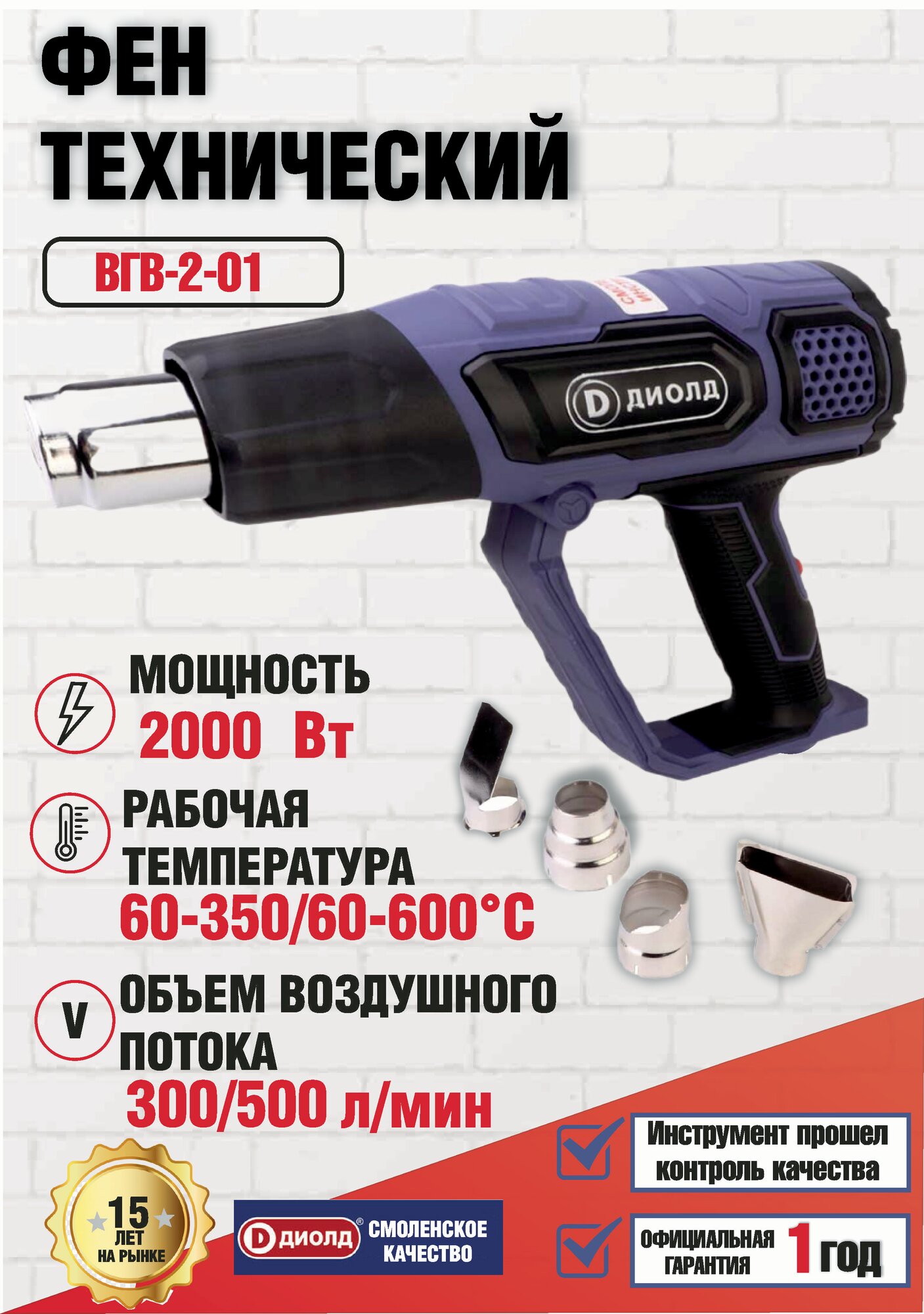 Фен строительный технический диолд ВГВ-2-01, 2000 Вт, плавное изменение температуры, 4 насадки, 60-600 градусов, производитель Россия
