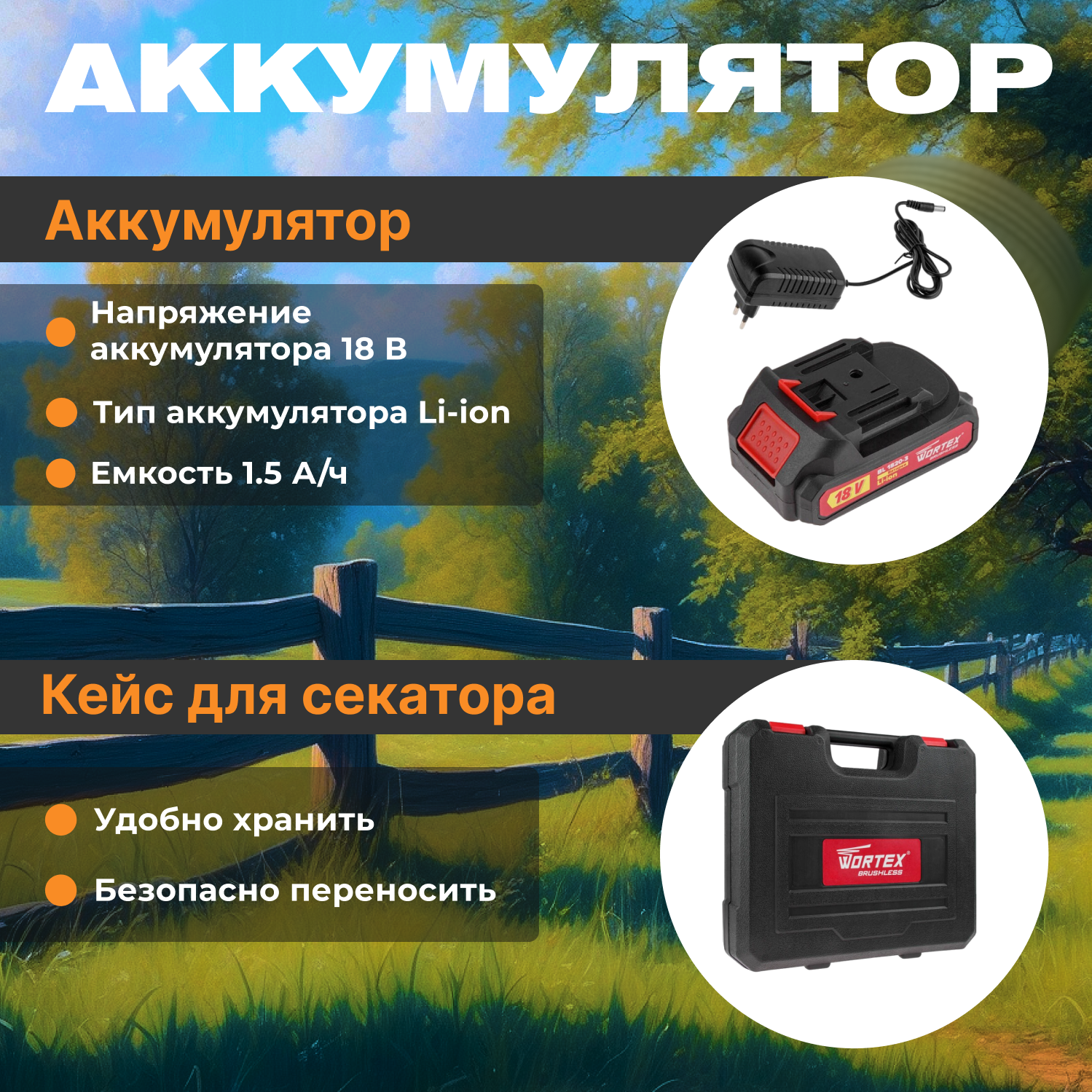 | Комплектация | Секатор; Точильный камень; Смазка для ножа; Паспорт; Ключи для зажима оснастки; 0329113 Аккумулятор WORTEX BL 1820-3 18.0 В, 1.5 А/ч, Li-Ion; 0329112 Зарядное устройство WORTEX SC 2120-1; |
