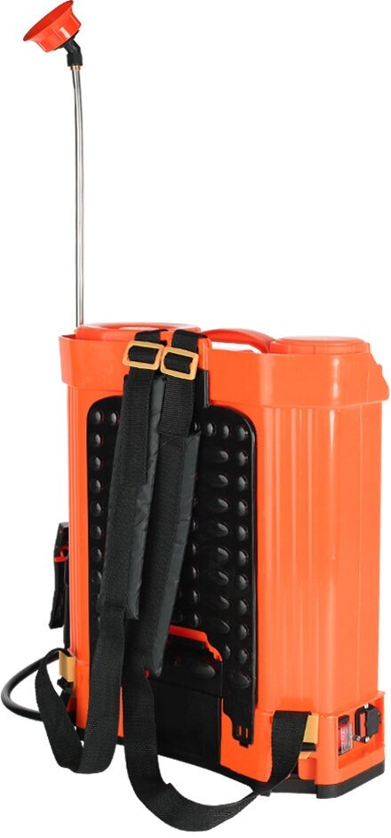 | Плюсы: | Отличный ранцевый распылитель, прост в использовании. В комплекте резервуар, лямки на плечи, аккумулятор съемный, 2 фильтр сеточки, шланг, телескопический удлинитель, 4 насадки, заточные прокладки, зарядное устройство, подключается к самому ранцу. Шланг выходит из ранца справа сбоку, левшам не очень удобно. Хороший насос всегда держит рабочее давление, распыляет хорошо дерево около 3 метров достаёт до верхушки. В самом ранце есть маленький пенал для хранения насадок и прочей мелочевки. После работы можно весь комплект сложить внутрь ранца, в резервуар для жидкости. Сверху удобная ручка для переноски |