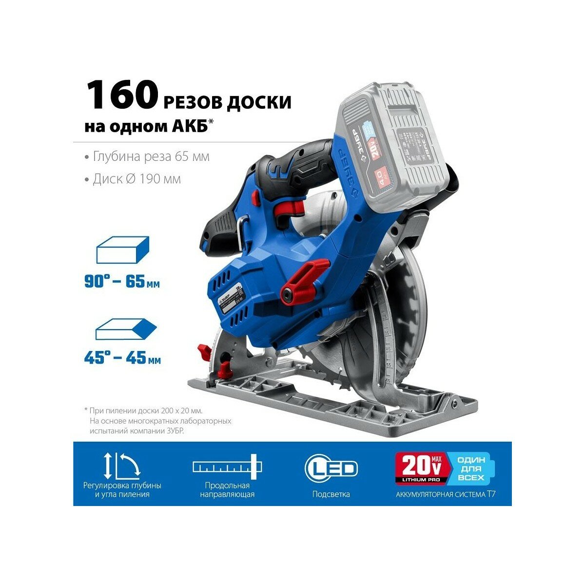 ЗУБР Т7, 20 В, d190 мм, 1 АКБ (4 А·ч), бесщеточная пила циркулярная, Профессионал (CPB-190-41)