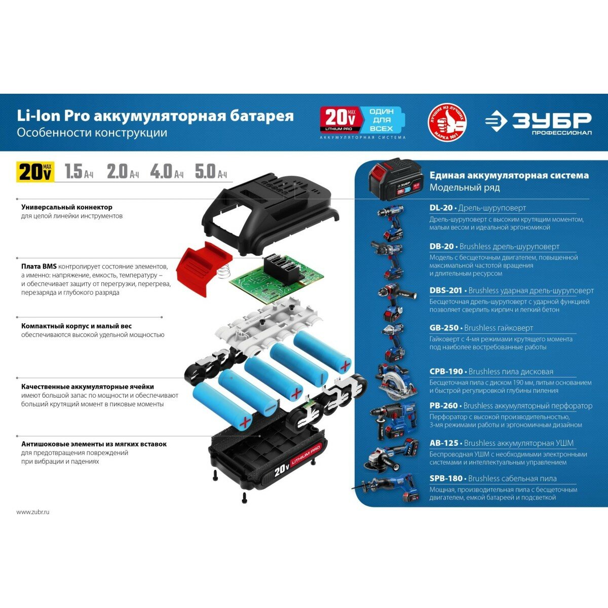 | Аккумуляторная система | ЗУБР 20V MAX Lithium PRO |