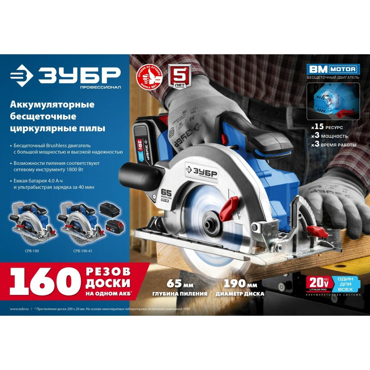 ЗУБР 20В, бесщеточная, 1 АКБ (4Ач), в коробке, пила циркулярная CPB-190-41 Профессионал