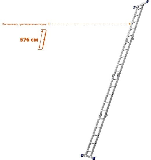 | Дополнительная информация | трансформация: стремянка, платформа, приставная лестница, г-образная лестница; размер профиля: 63х25х1.25 мм, 60.2х22.5х1.5х2.0 мм; стальные шарнирные соединения с замками; рифленые ступени, размер профиля ступеней 25х25х1.25 мм; съёмные траверсы шириной 80 см с противоскользящими пластиковыми опорными наконечниками |