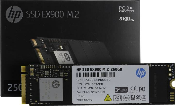 SSD диск HP M.2 EX900 250 Гб PCIe Gen3x4, NVMe1.3 3D TLC (2YY43AA)