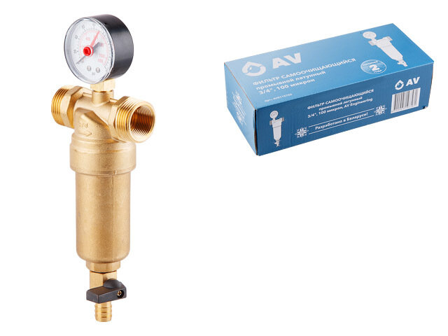 Фильтр самоочищающийся промывной латунный 3/4", 100 микрон, с манометром AV Engineering (AVE115702)