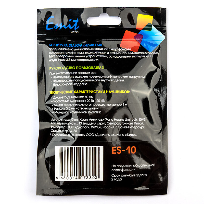Гарнитура внутриканальная Dialog Emit ES-10, чёрный