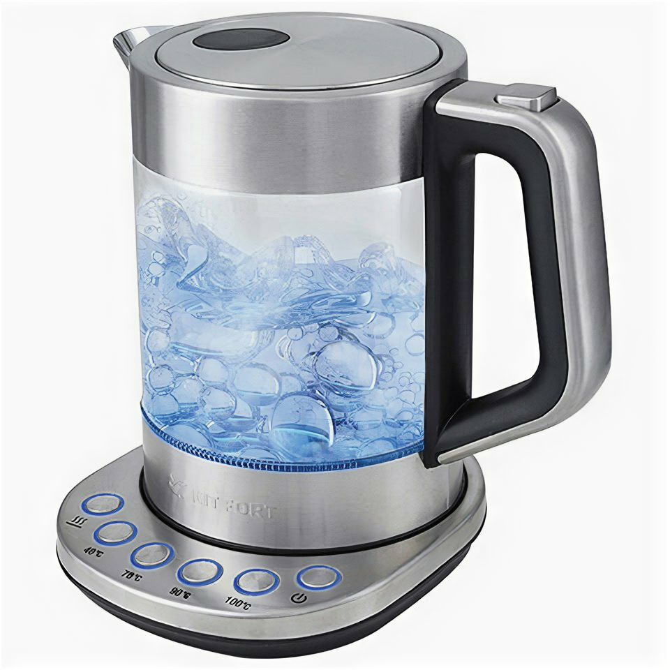 Купить Чайник электрический стеклянный KITFORT КТ-616, 1,5 л, 2200 Вт, закрытый нагревевательный элемент, 4 режима нагрева, серебристый, KT-616