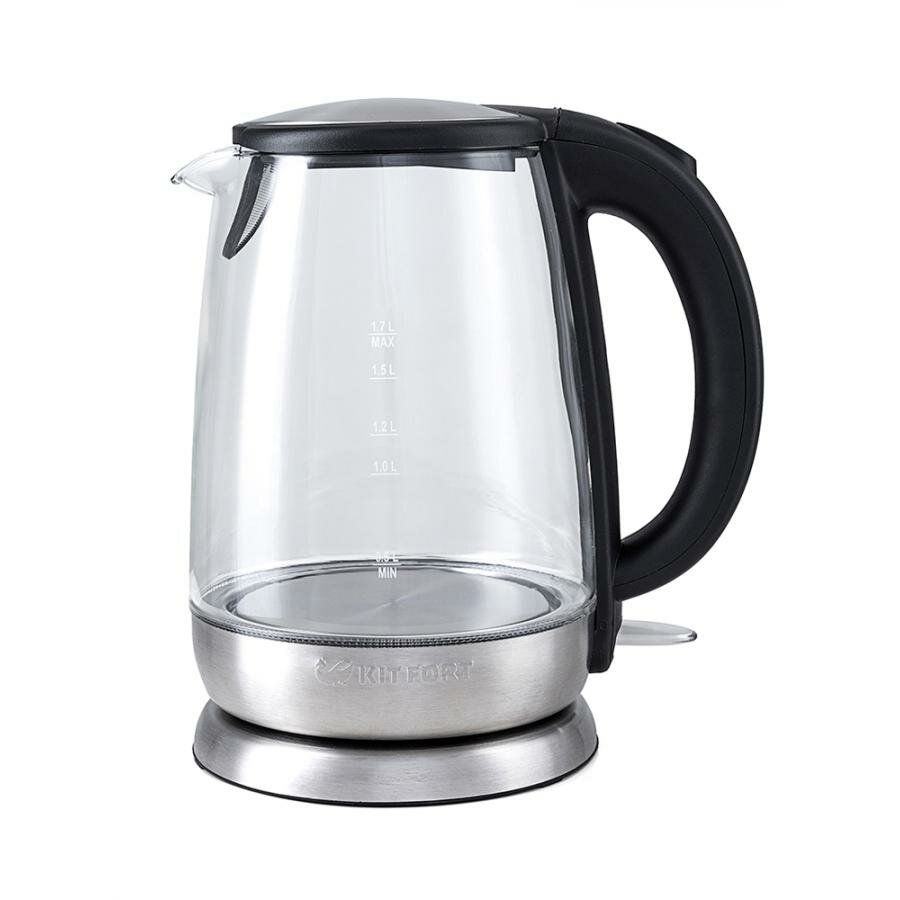 Чайник электрический стеклянный KITFORT КТ-619, 1,7 л, 2200 Вт, закрытый нагревательный элемент, серебристый, KT-619