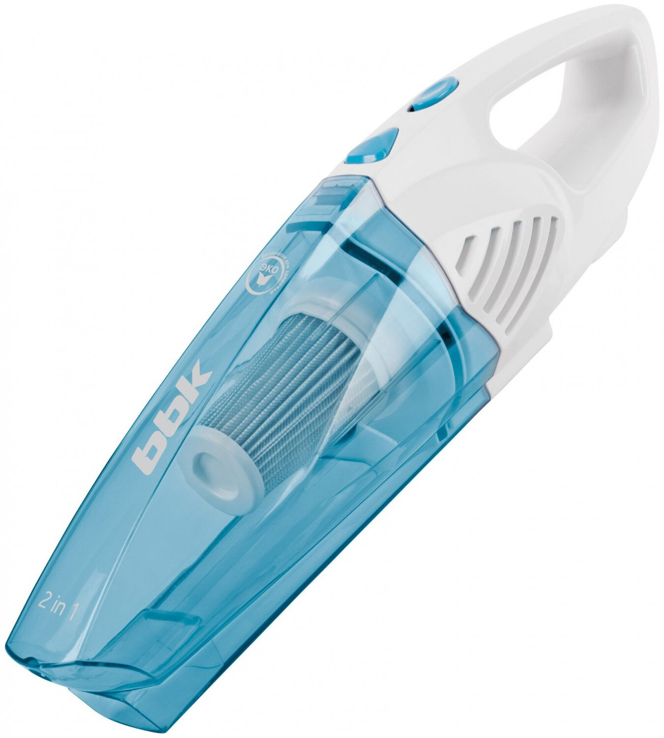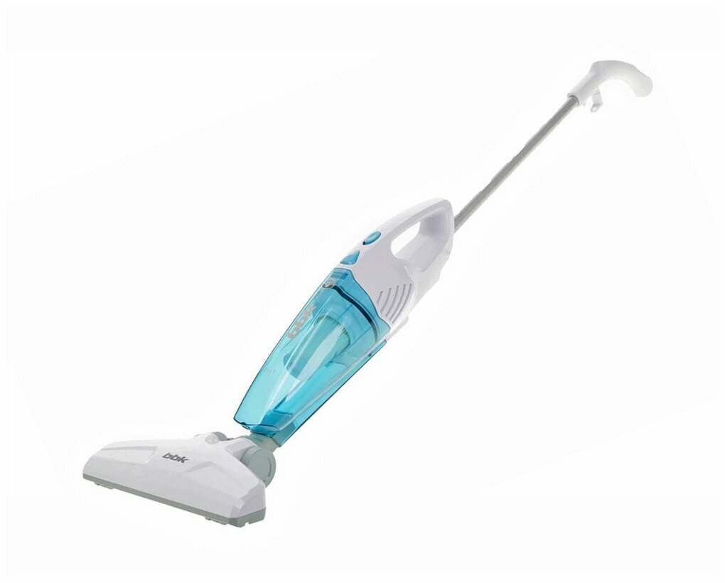 Вертикальный пылесос BBK BV2511 белый/голубой, мощность всасывания 110 Вт, объем пылесборника 0,8 л, HEPA фильтр, 2 насадки в комплекте
