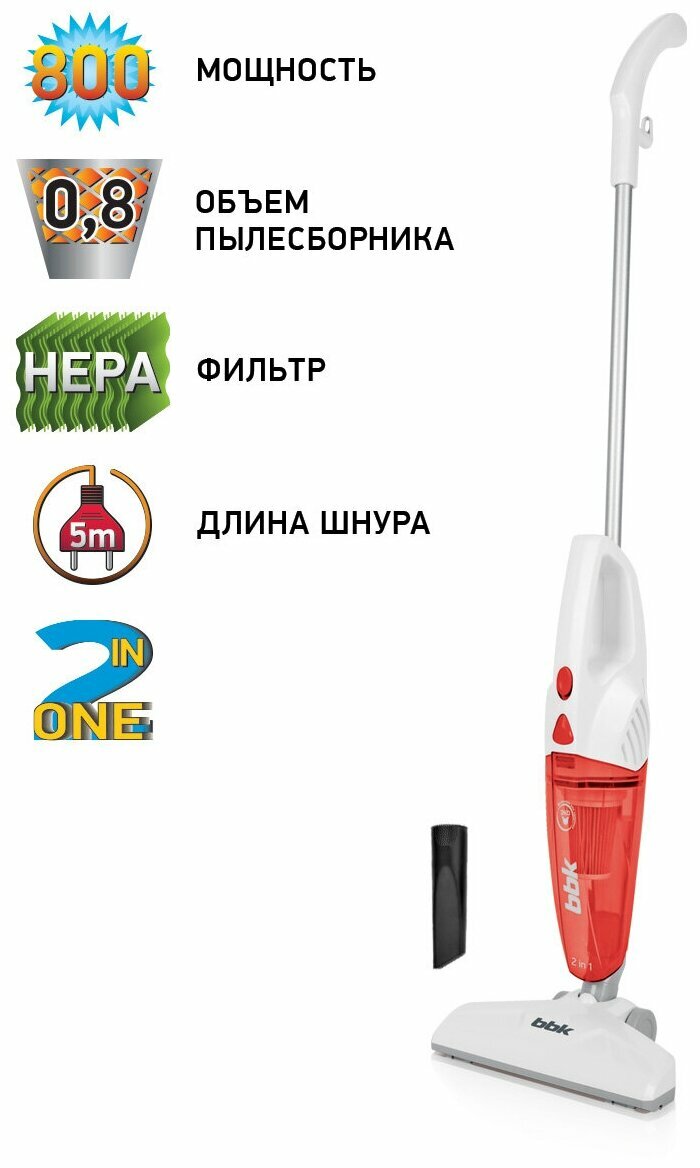 Вертикальный проводной пылесос "2 в 1" BBK BV2511 белый/красный, объем пылесборника 0,8 л, мощность всасывания 110 Вт, нера фильтр