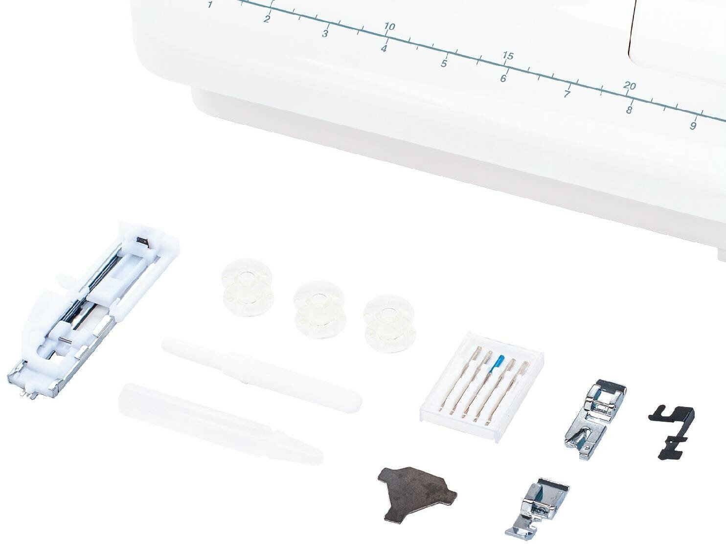 | Дополнительная информация | дополнительный подъем прижимной лапки, автостоп при намотке нитки на шпульку, линейка на корпусе. |
