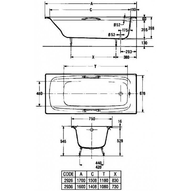 Чугунная ванна Jacob Delafon Diapason 170x75 E2926-00 с отверстиями для ручек