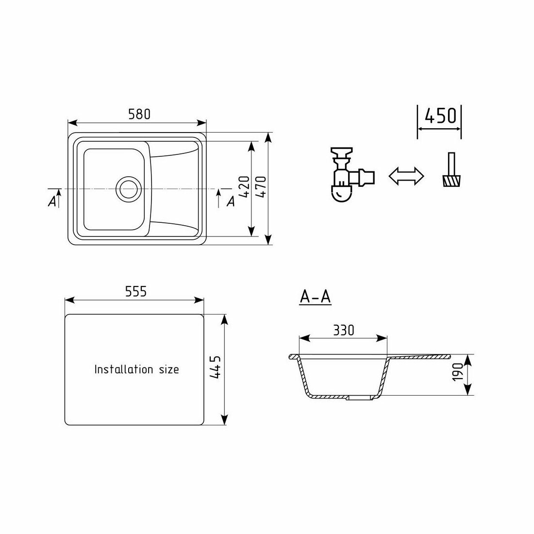 Мойка Ulgran, мрамор, U-201-308, (580*470*190 мм), черный, сифон и сливная арматура