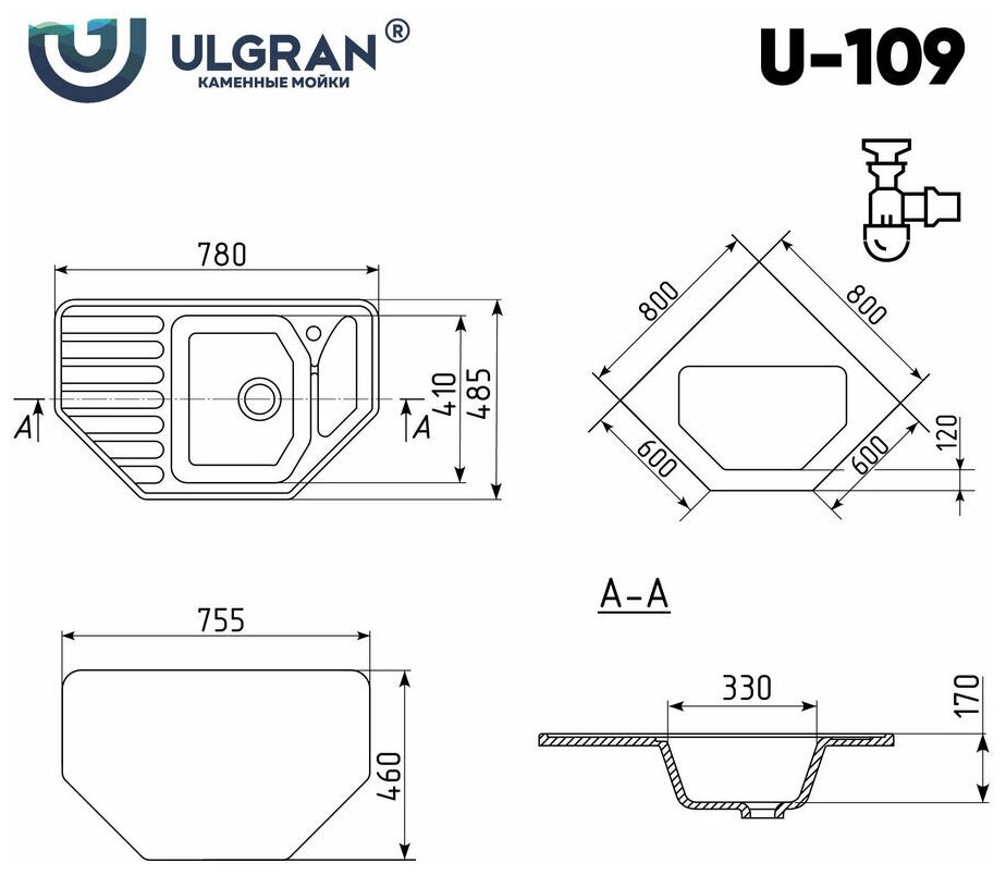 Кухонная мойка U-109 780*490мм угловая (341) ультра-белый