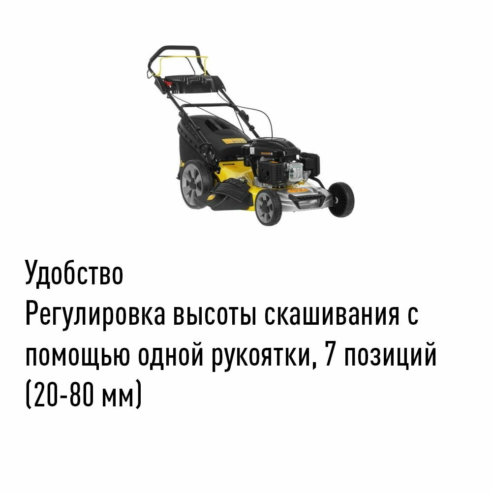 | Дополнительные функции | возможность установки мульчирующей насадки / регулировка высоты скашивания / тормоз двигателя |