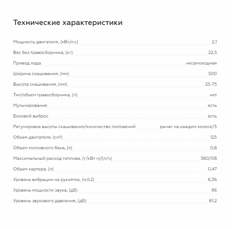 | Дополнительные функции | возможность установки мульчирующей насадки / регулировка высоты скашивания / тормоз двигателя |