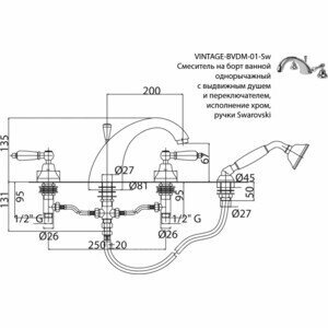 Смеситель на борт ванны хром, ручка Swarovski Cezares Vintage VINTAGE-BVDM-01-Sw