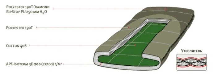 | Минусы: | если палатка под небольшим наклоном, то спальник съезжает, хотя вероятно это свойства ткани с защитой от промокания |