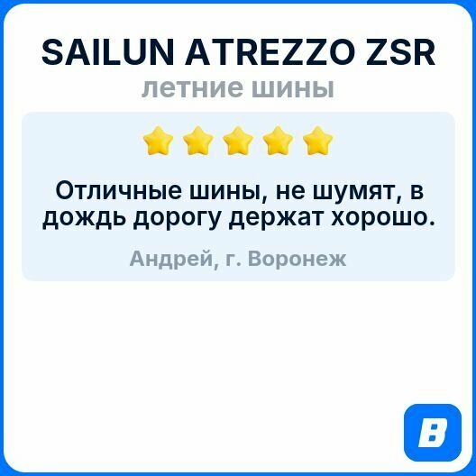 | Отзыв: | Приобрел автомобильные шины Sailun Atrezzo ZSR, на свой Фольцваген Пассат, это очень хорошие автошины, которые очень хорошо держат дорогу, как при дожде, так и при сухом асфальте, при экстренных поворотах. Тормозной путь на этих шинах, прекрасный, так что при аварийном торможении на них можно положиться, за счет рисунка протектора, они практически бесшумны. Это прекрасные автошины, о приобретении которых, я не пожалел. |