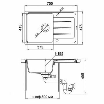 Мойка EWIGSTEIN кварц Elegant 50F 1-чаша + крыло 762*480мм черный