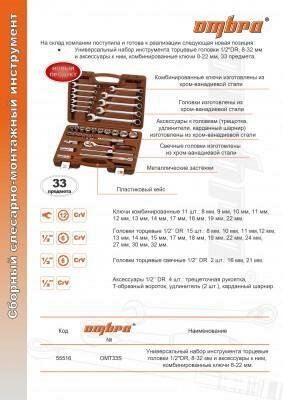набор инструмента универсальный 33пр 1/2"dr 8-32мм торц. головки и 8-22мм комб. ключи ombra omt33s п