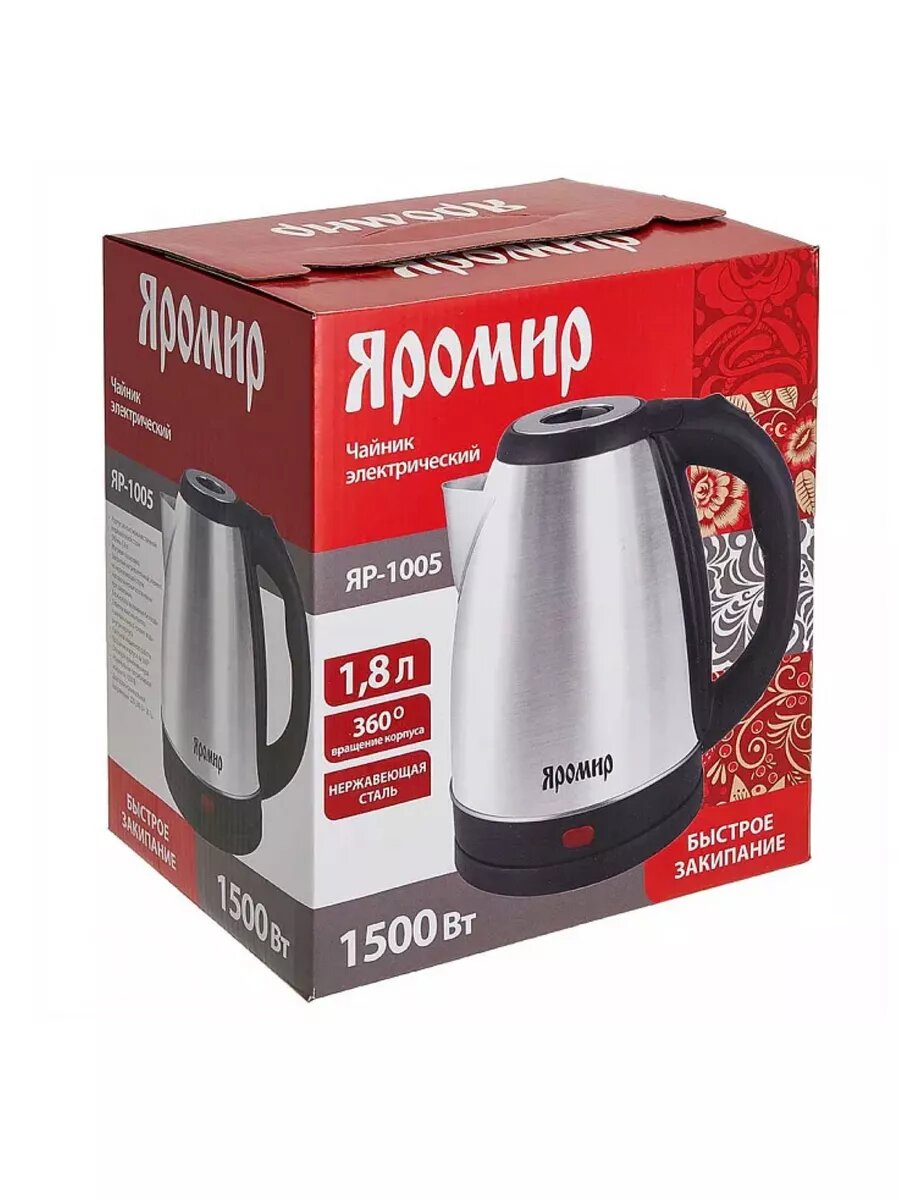 Чайник электрический яромир ЯР-1005 1,8 л, 1500 Вт, черный/серебристый