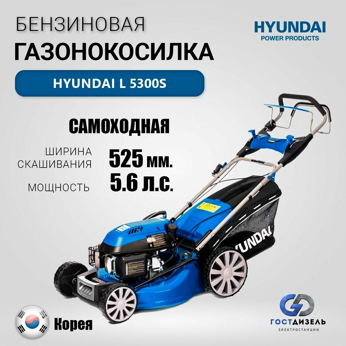 HYUNDAI [L 5300S] Бензиновая газонокосилка {самоходная, двигатель Hyundai ICV 200,4-х такт, 5,6 л.с./196 см3, Ширина сре