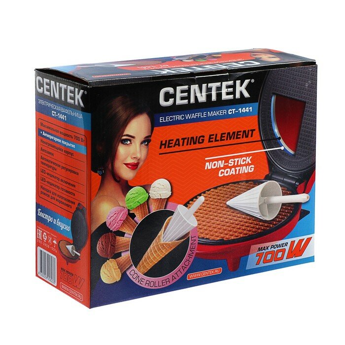 Купить Электровафельница Centek CT-1441, 700 Вт, тонкие вафли, антипригарное покрытие, красная