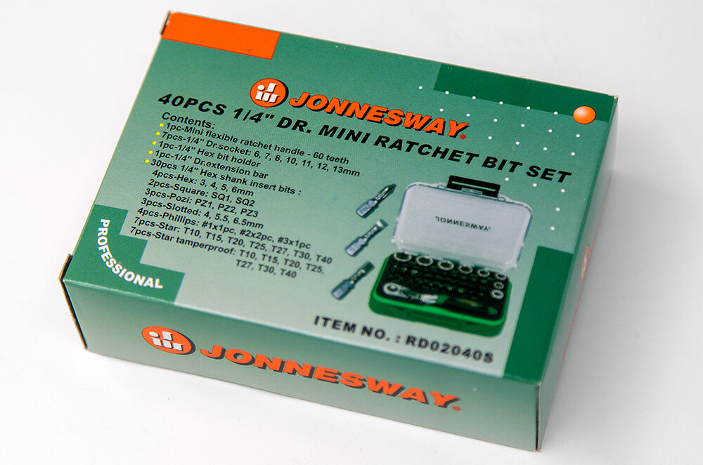 JONNESWAY RD02040S Набор рукоятка трещоточная миниатюрная 1/4DR со вставками-битами и гоовками торцевыми 40прметов