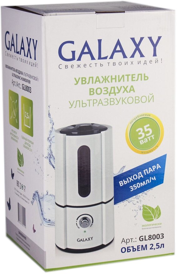 Увлажнитель воздуха ультразвуковой Galaxy GL 8003. 35Вт. Съемный резервуар для воды 2,5л. Площадь увлажнения 30м/кв. Производительность 350мл/ч.