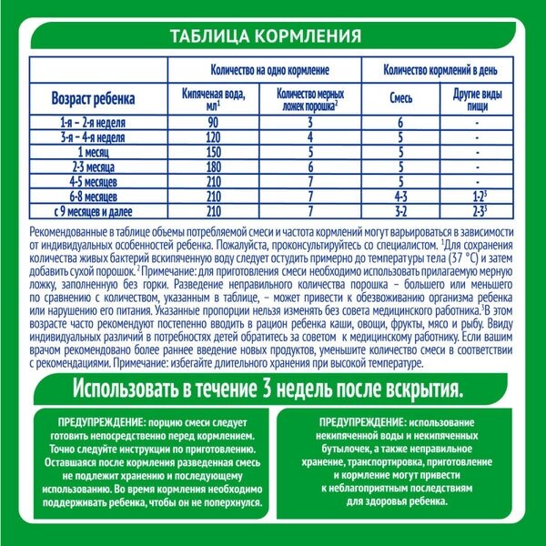| Плюсы: | Хорошая смесь, наладился стул, ребёнок ходит ежедневно, наедается |