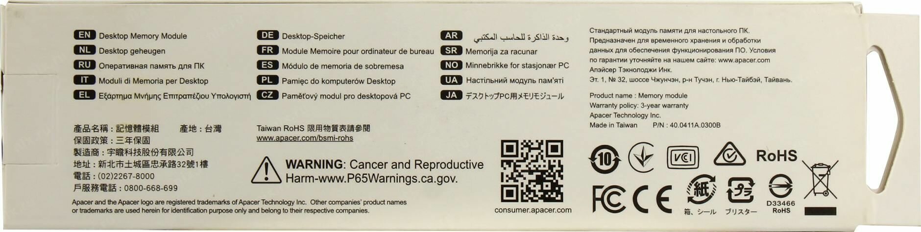Оперативная память Apacer DDR3 4GB 1600MHz UDIMM (PC3-12800) CL11 1,35V (Retail) 512*8 3 years (AU04GFA60CATBGJ/DG.04G2K.KAM)