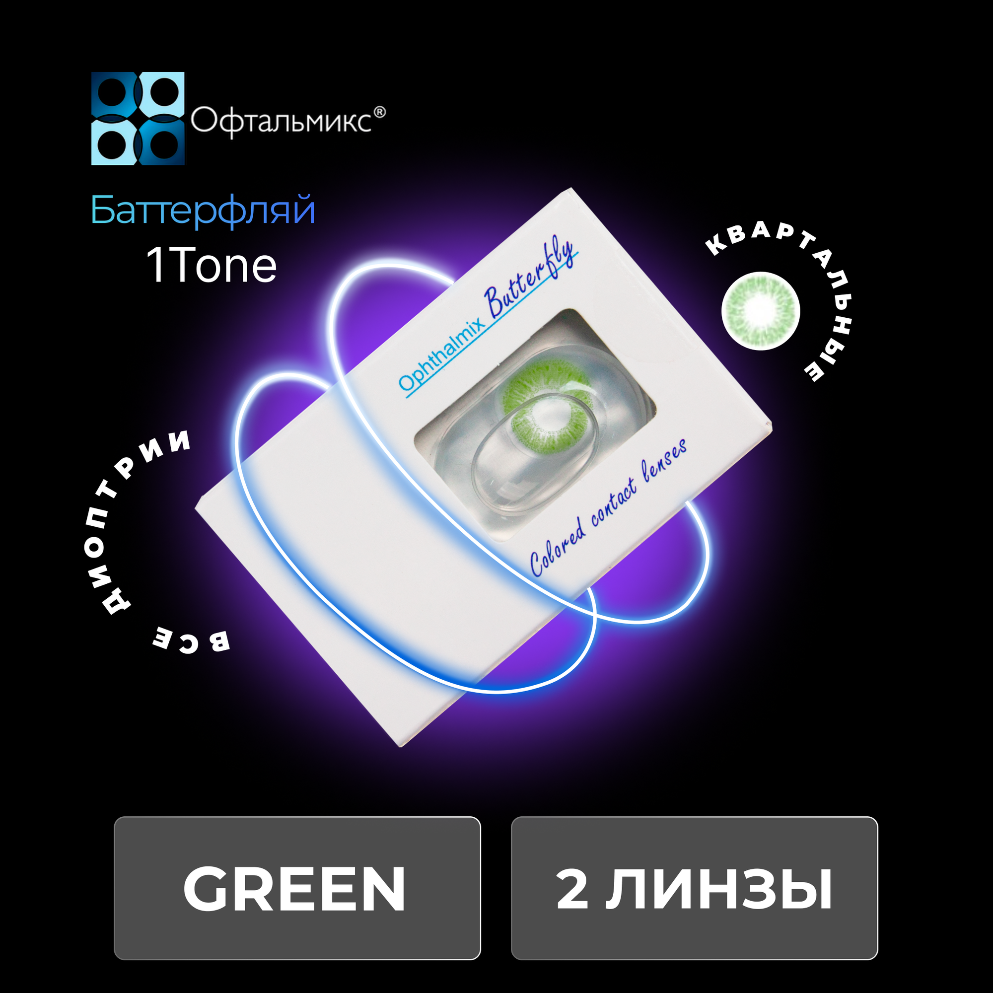 Офтальмикс Butterfly 1-тоновые 2 линзы В упаковке 2 штуки Цвет Green Оптическая сила -1 Радиус кривизны 8.6