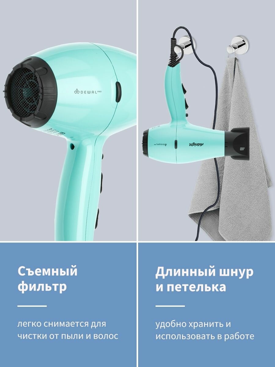 Фен DEWAL PRO MIDNIGHT, мятный, вес 550гр, 2000Вт, ионизация, 2 нас, провод 3м