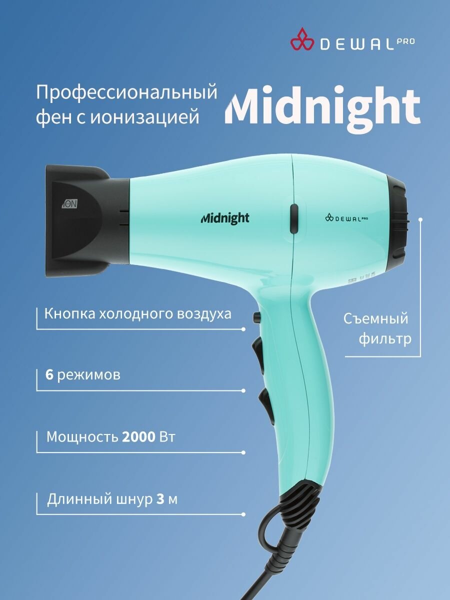 Купить Фен DEWAL PRO MIDNIGHT c ионизацией, мятный, вес 550 гр, 2000 Вт, 2 насадки, провод 3 м 03-107 Mint